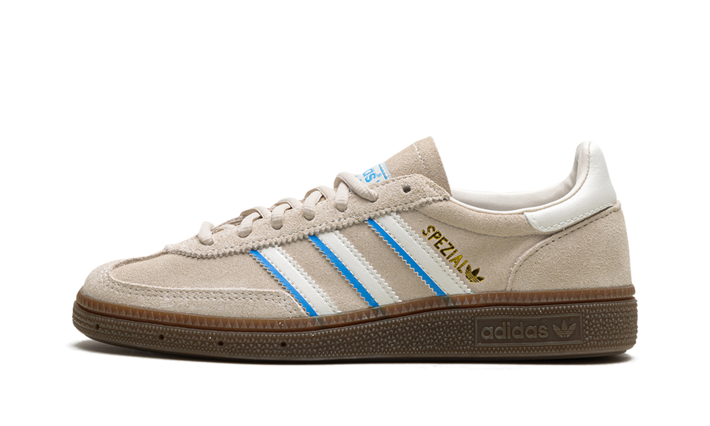 The adidas Handball Spezial “Aluminum” is a versatile, neutral colorway of the lifestyle shoe. The adidas Handball Spezial is a popular, casual sneaker with a versatile silhouette. On this colorway, the shoe features an Aluminum suede upper with Cloud White leather Three Stripes on the sides accented with blue. A gold “Spezial” logo is printed on the lateral side of the mid-panel. Cloud White accenting can be found on the leather heel tab, laces, and on the tongue tag featuring blue “adidas” detailing. A dark gum rubber sole completes the look. Aluminium