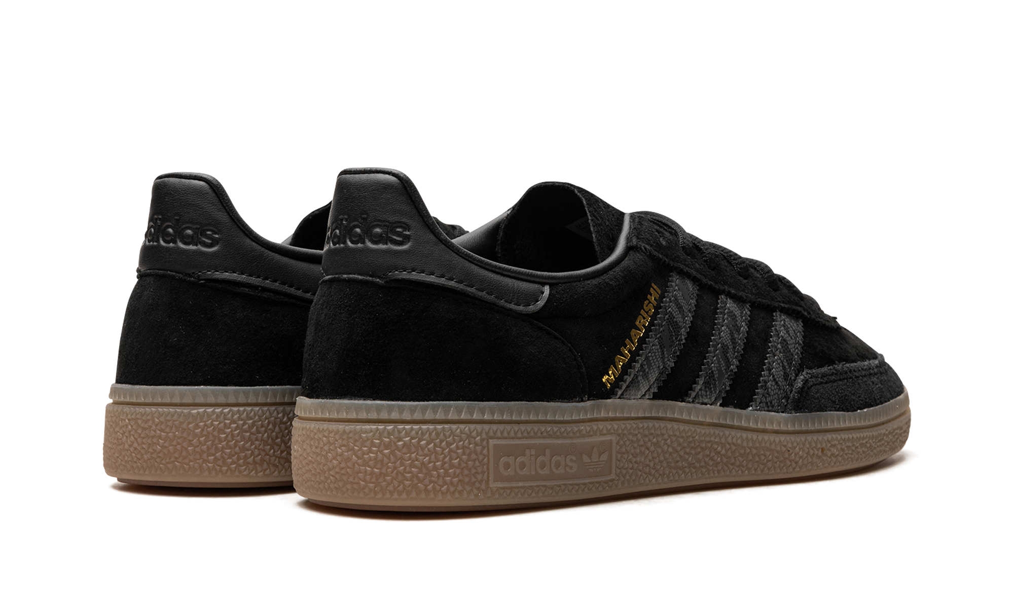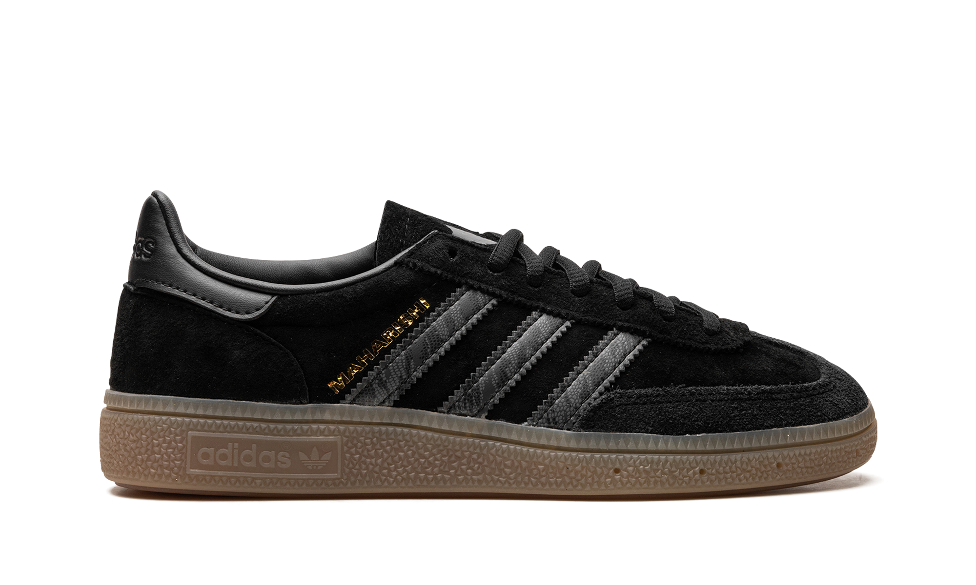 The Maharishi x adidas Handball Spezial "Black/Gum" is a collaboration by the London-based clothing brand and adidas on the retro-inspired sneaker. Originally released in 1979 for handball players, the adidas Handball Spezial is now beloved for its timeless look and easy-to-wear style. Here, Maharishi updates the silhouette with a black suede construction with tonal leather Three Stripes and gold “Maharishi” branding on the side. A subtle snakeskin texture is also added to the Three-Stripes on each side. More “Maharishi” branding can be found on the tongue, as well. Underfoot, a gum rubber sole gives the sneaker a vintage flair. Release date: October 14, 2023 maharishi - Black Gum
